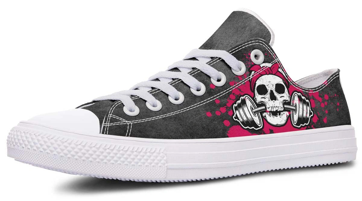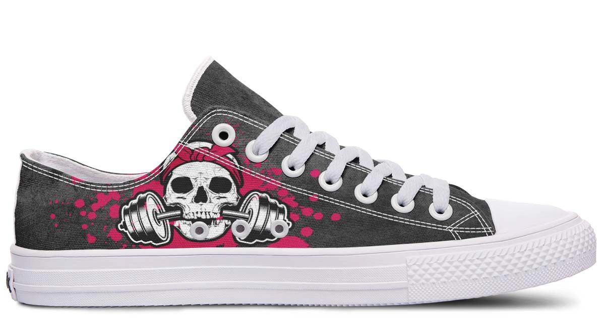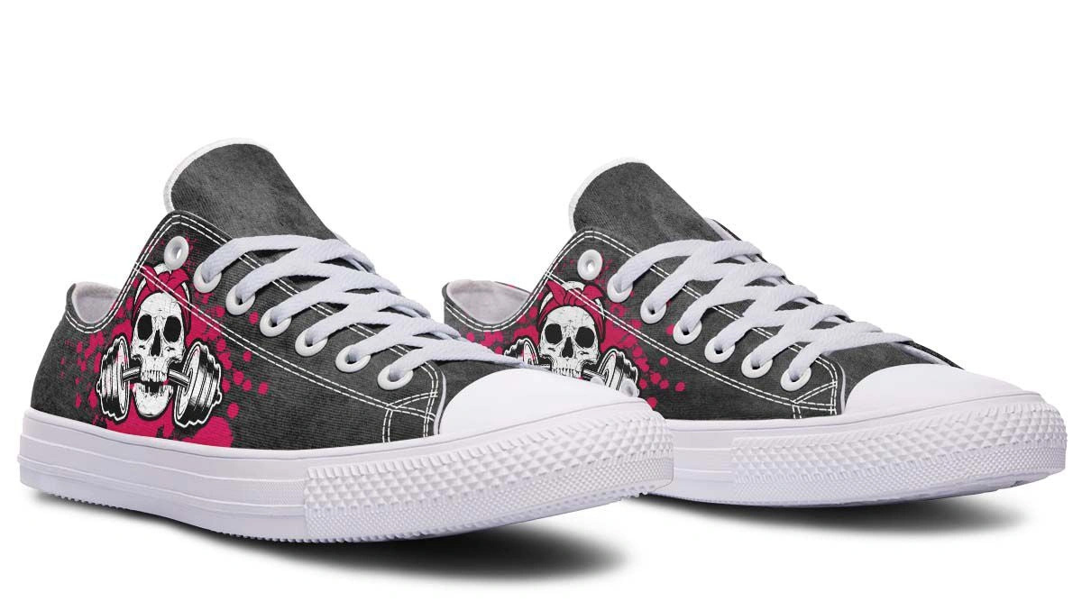 Stand out with Pink Skull & Dumbbell white lowtop sneakers. Edgy fitness-themed graphics on a sleek white design, perfect for gym lovers and casual style.